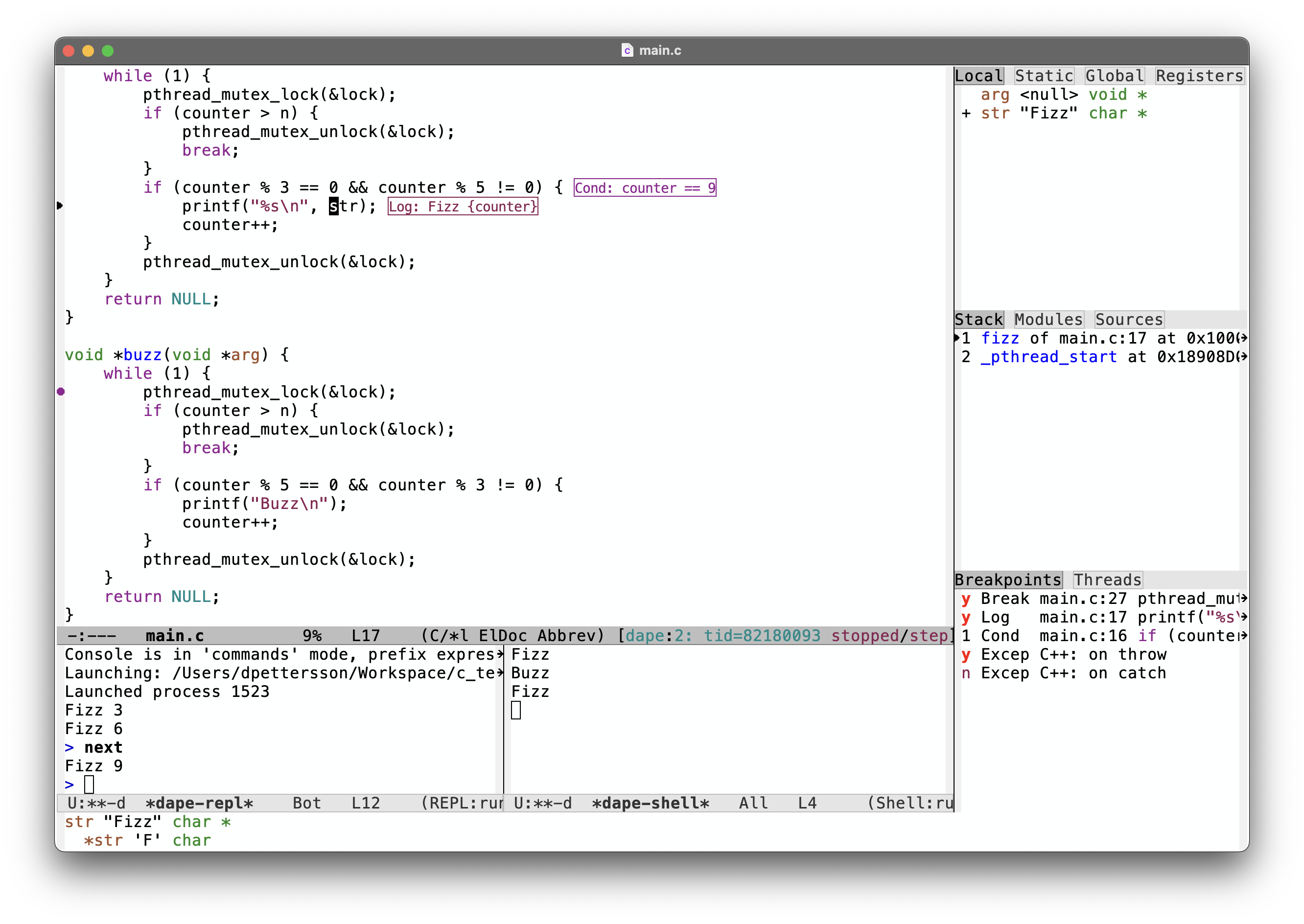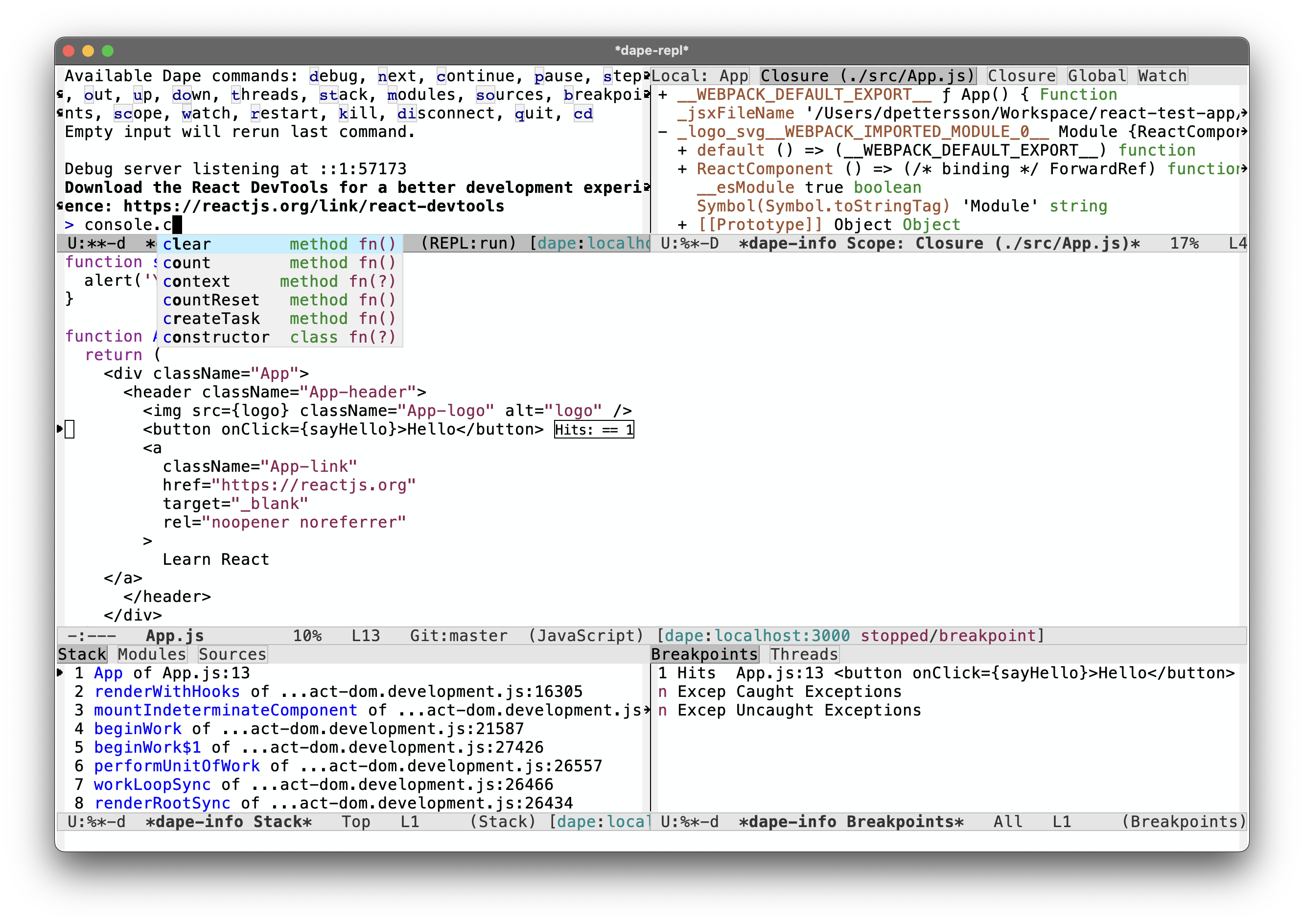 Dape is a debug adapter client for Emacs. The debug adapter protocol, much like its more well-known counterpart, the language server protocol, aims to establish a common API for programming tools. However, instead of functionalities such as code completions, it provides a standardized interface for debuggers.